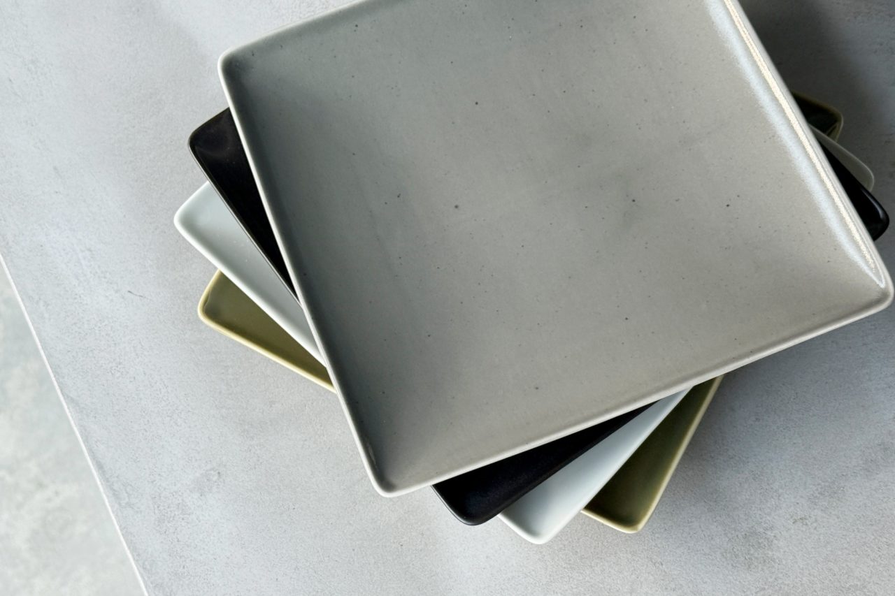 25.5cm角のお皿は、メインディッシュにちょうどいいサイズ感。縁に反りがあるのでお皿を運ぶときにも指がかりがよく、ソースなどもこぼれにくい形状です。