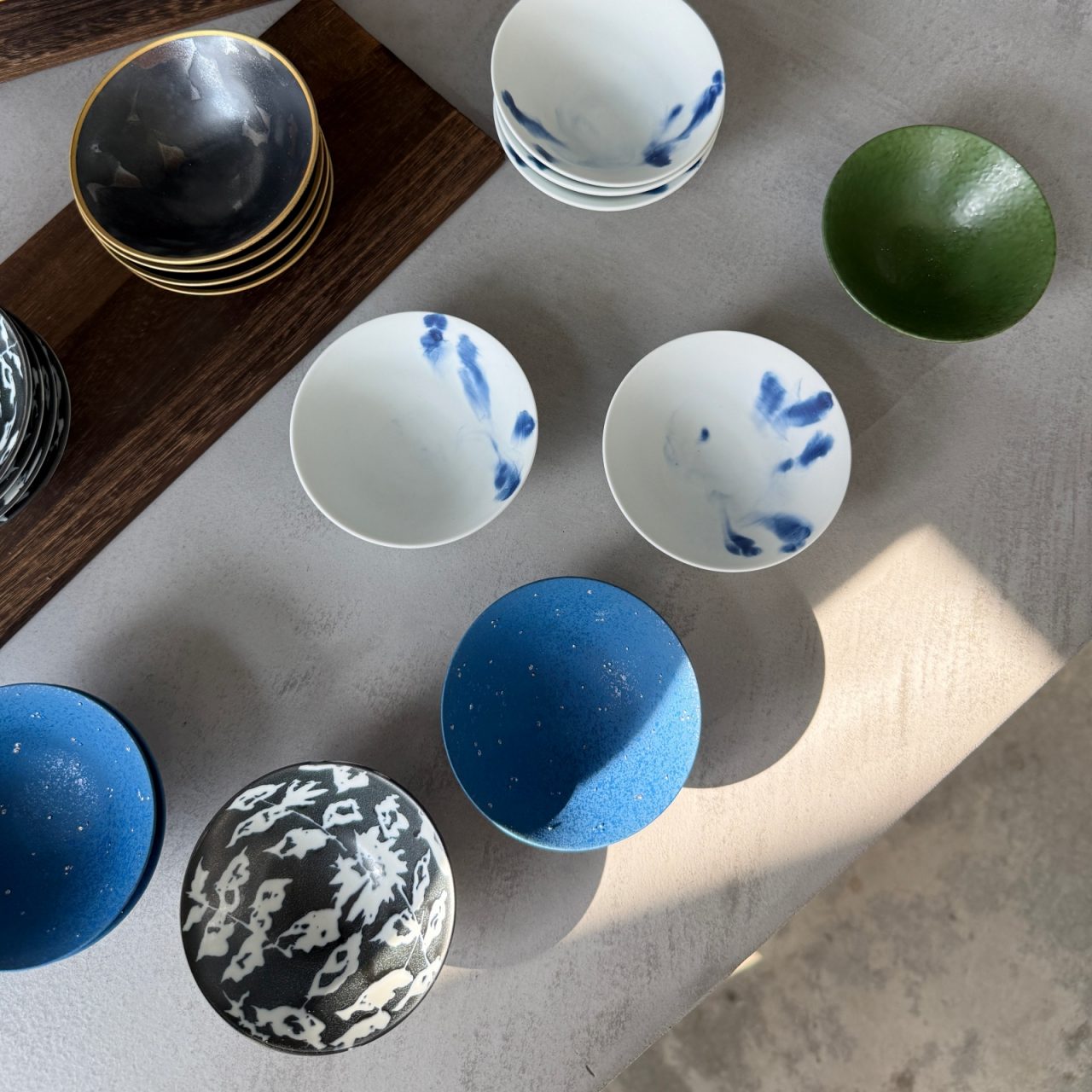釉薬の垂れ方に個体差がある素磁釉流しの香酒盃も大変好評で、今回の入荷分は残りわずか。